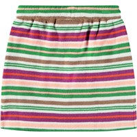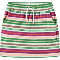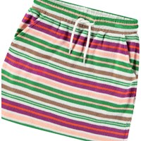 Stribet mulitfarvet nederdel i blødt bomuldsfrotté. Nederdelen har lommer fortil, er knælang, har elastik i taljen samt snørelukning.
