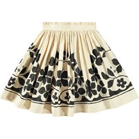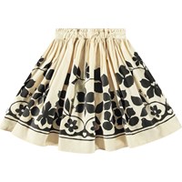Råhvid nederdel i økologisk bomuld med print af sorte blomster, der følger skørtet rundt. Nederdelen er knælang med et taljebånd, der er fast foran og elastisk bagpå, hvilket gør den nem at komme i og behagelig at have på.
