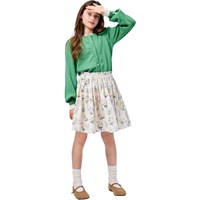 Råhvid nederdel i blød, økologisk bomuldspoplin med print farverige sommerblomster. Nederdelen er knælang og har et taljebånd med en fin, lille flæsekant – fast foran og elastisk bagpå – samt en usynlig lynlås i siden, der gør den nem at tage på og behagelig at have på. Skørtet har fine rynker fra taljen, som giver det et let fald og en livlig bevægelse.