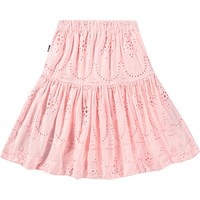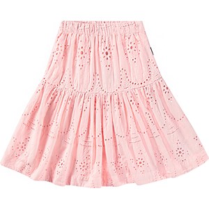 Støvet lyserød nederdel i økologisk bomuld med broderie anglaise. Nederdelen har et underskørt, er knælang, elastik i taljen samt et bærestykke med påsyet skørt der giver den volumen. Kombiner den med matchende skjorte i samme materiale og farve og få et komplet sæt.