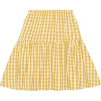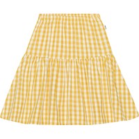 Hvid og korngul ternet nederdel. Nederdelen er knælang, elastik i taljen samt et bærestykke med påsyet skørt der giver den volumen.