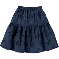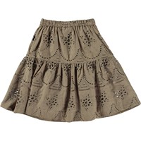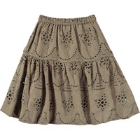 Beige midi nederdel i allover broderie anglaise. Denne nederdel er fremstillet i 100% bomuld, har elastik i taljen, et bærestykke med påsyet skørt for mere volumen, samt et regulært fit. Match evt. denne nederdel med skjorten, Runa, i samme farve og materiale, for det perfekte sæt.