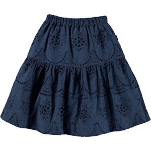 Mørkeblå midi nederdel i allover broderie anglaise. Denne nederdel er fremstillet i 100% bomuld, har elastik i taljen, et bærestykke med påsyet skørt for mere volumen, samt et regulært fit. Match evt. denne nederdel med skjorten, Runa, i samme farve og materiale, for det perfekte sæt.