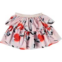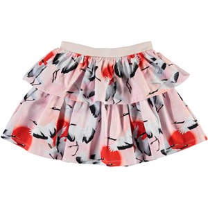 Bini er en nederdel i lyserød med print af røde prkker og flyvende traner. Nederdelen har 2 lag og en elastisk talje.