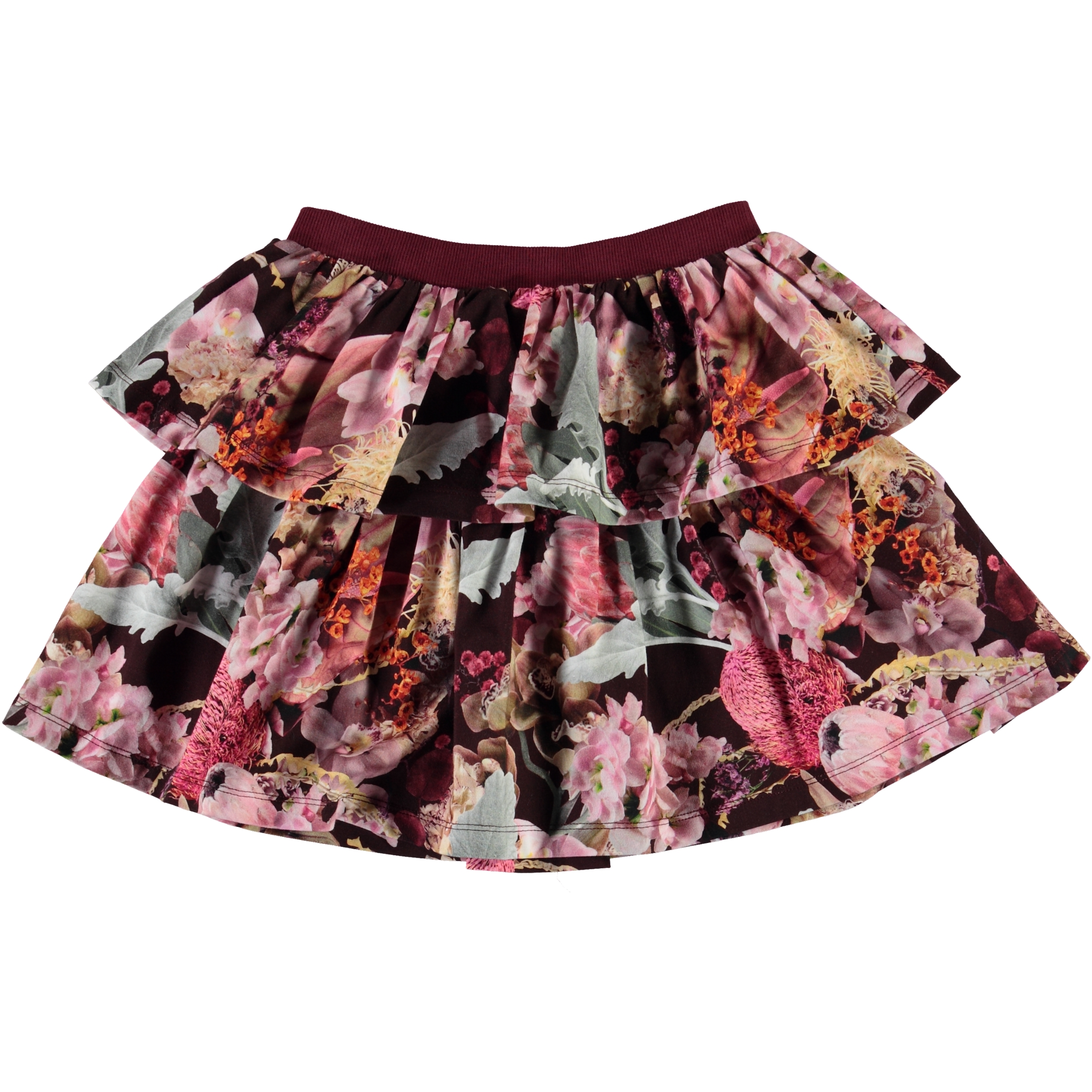Bini er en nederdel i boardeuax med flot blomster print. Nederdelen har 2 lag og en elastisk talje.