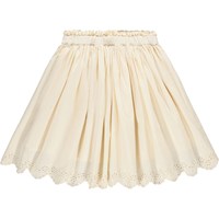 Råhvid nederdel i blød, økologisk bomuldspoplin med smukke broderie anglaise-detaljer langs kanten. Nederdelen er knælang og har et taljebånd med en fin, lille flæsekant – fast foran og elastisk bagpå – samt en usynlig lynlås i siden, der gør den nem at tage på og behagelig at have på.