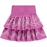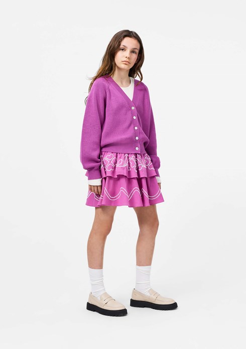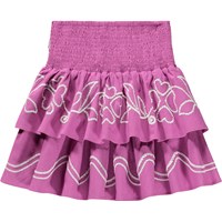 Lilla, knælang nederdel i blød økologisk bomuld, med bred smock i taljen, som sikrer en fleksibel pasform og gør den nem at tage på. Nederdelen består af to lag skørt med broderi, som giver den en flot volumen og et let, levende udtryk.