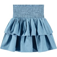Blå knælang nederdel i økologisk bomuldschambrey. Nederdelen har en bredt taljestykke syet med smog med et voluminøst skørt i 2 lag. Det elastiske taljestykke gør den nemt at komme i samt er behageligt at have på.