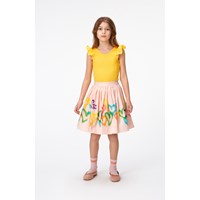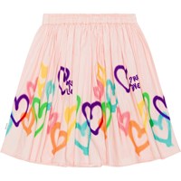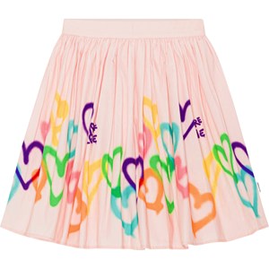 Lyserød nederdel i økologisk bomulds poplin. Nederdelen har en fast talje fortil hvor bagtil er den elastisk så den er nem at komme i. Skørtet er rundskåret og rynker rundt i taljen. Multifarvet, graffitimalet hjerteprint, der følger nederdelen rundt.