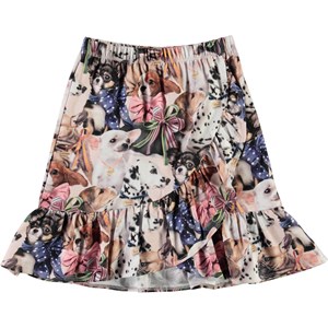 Bradie er en nederdel med slå-om effekt og elastisk talje. Nederdelen er her med print af små hunde med sløjfe om halsen.