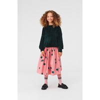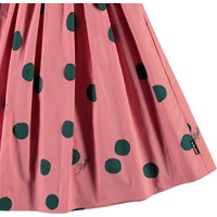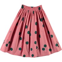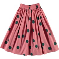 Bree er en lang poplin bomulds nederdel i pink med print store grønne prikker. Nederdelen har en flot volumen og elastisk talje, som gør den rigtig behagelig at have på.