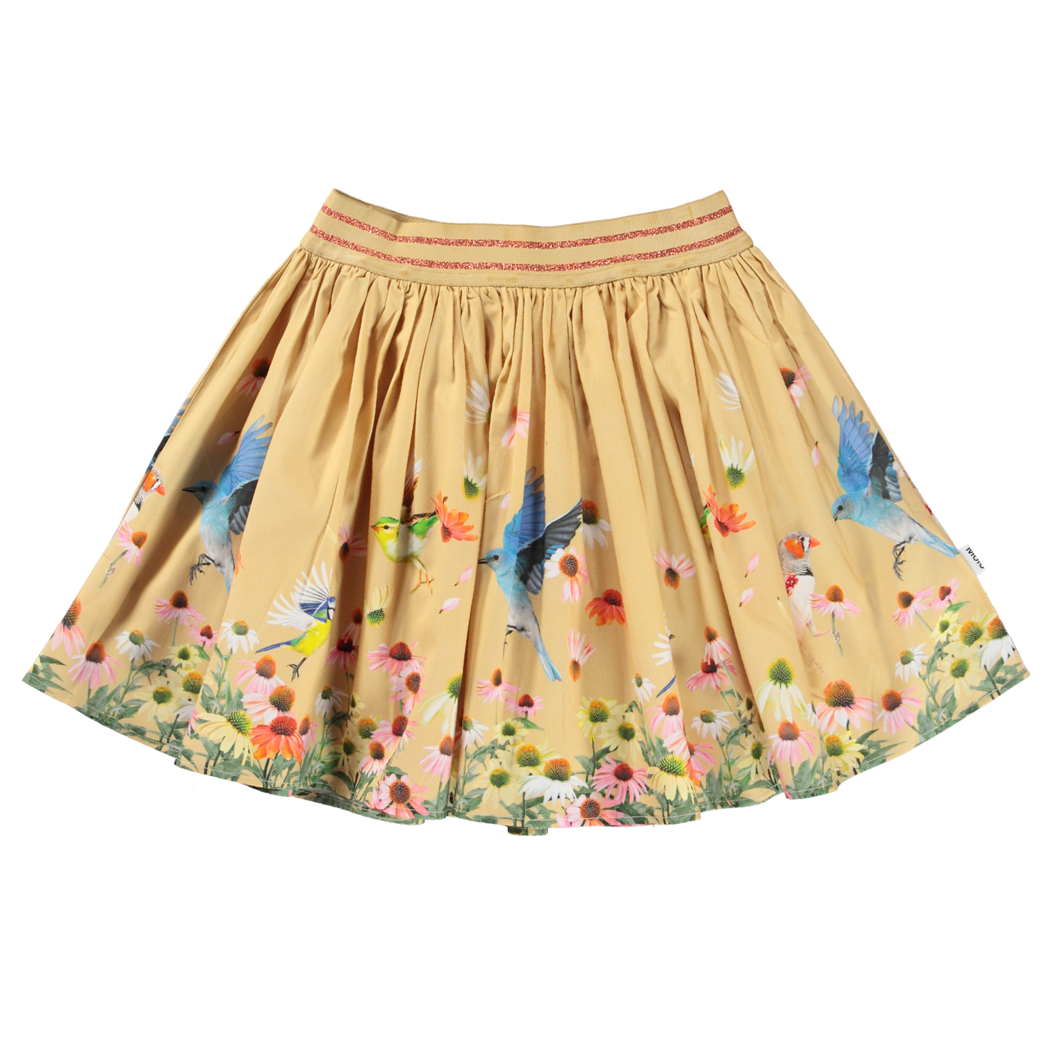 Brenda er en lysegul nederdel med print af en blomstermark og fugle. Nederdelen har elastisk talje med smalle gyldne striber.