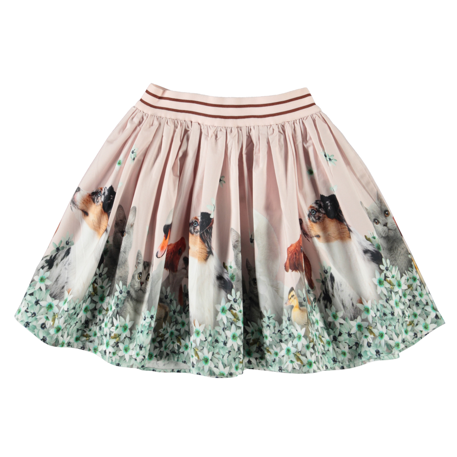 Brenda er en lyserød, rundskåret nederdel i økologisk bomulds poplin. Brenda har en elastisk talje med 2 bordeaux striber, og skørtet er i printet Friends and Flowers. Her ser man hvordan forskellige arter af dyrevenner hygger sig på en blå blomstereng.