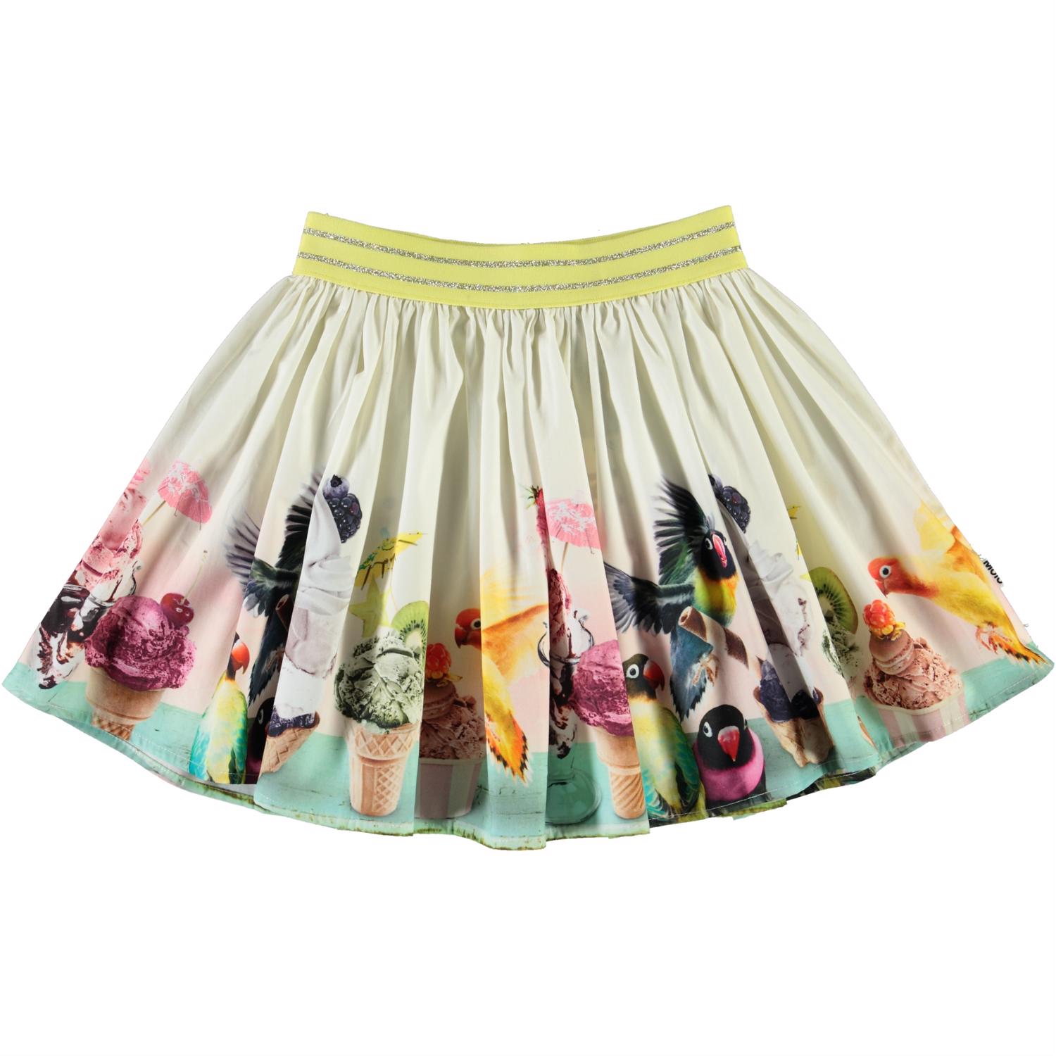Brenda er en let bomulds nederdel med print af fugle som spiser forskellige isdeserter.