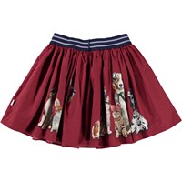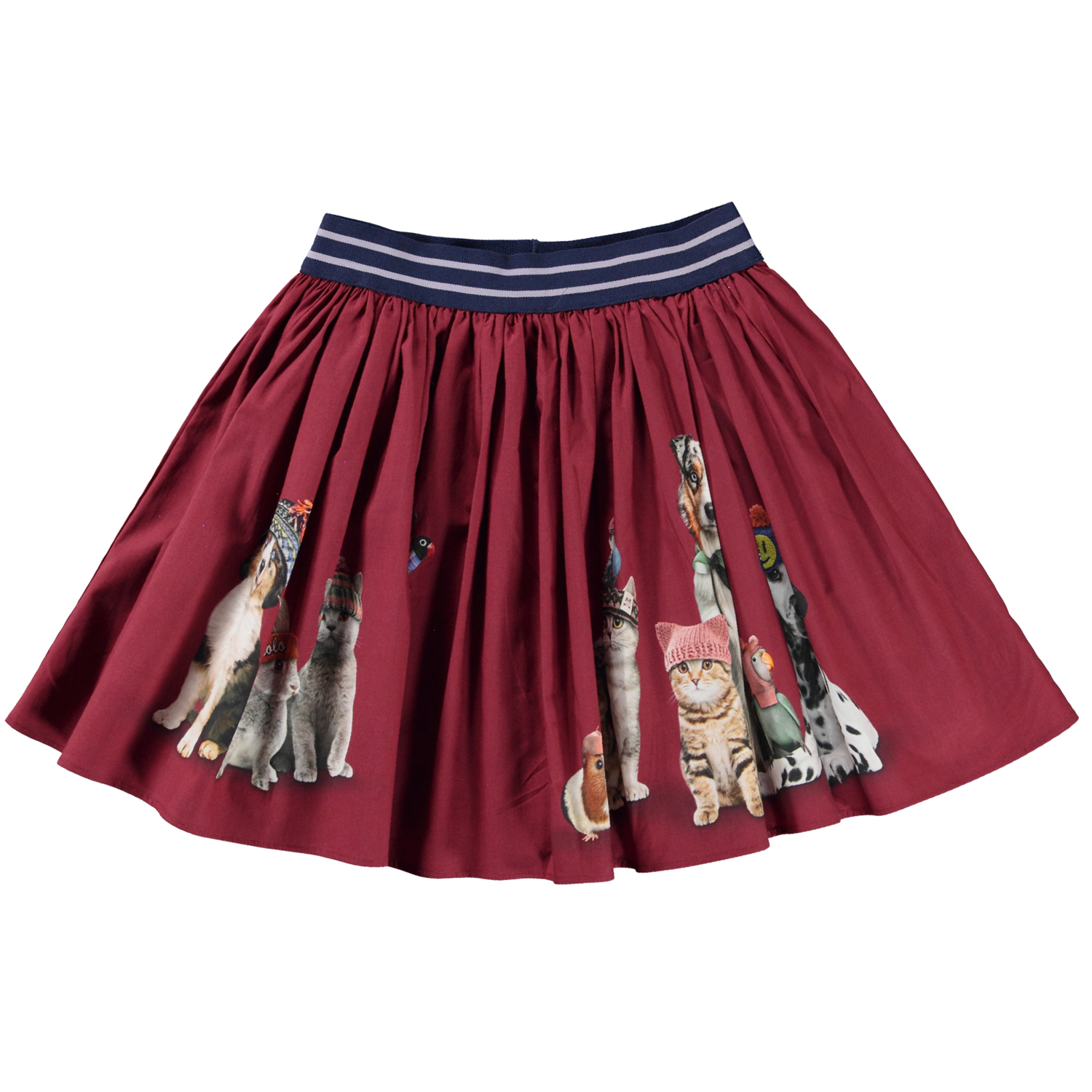 Brenda er en mørkerød nederdel med print af forskellige kæledyr med huer og pandebånd på. Nederdelen har elastisk mørkeblå talje med smalle striber.