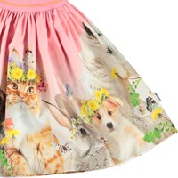 Lyserød rundskåret nederdel i økologisk bomuld. Nederdelen er behagelig og nem at iføre sig med den elastiske stribede talje. Nederdelen har print af fine dyreunger med blomsterkroner.