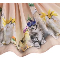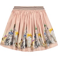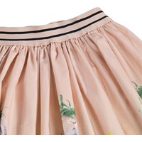 Lyserød, rundskåret nederdel i blød, økologisk bomuldspoplin. Taljen har en bred, stribet elastik, der både sikrer en god pasform og tilføjer et sporty twist. Det knælange skørt har masser af fylde og liv, og det charmerende print med dyr iført farverige blomsterhatte giver nederdelen et legende og fantasifuldt udtryk.