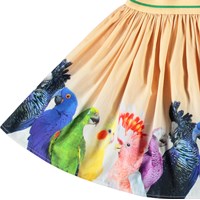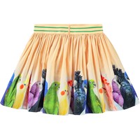 Lys orange rundskåret nederdel i økologisk bomuld. Nederdelen er behagelig og nem at iføre sig med den elastiske stribede talje. Nederdelen har print af små farvestrålende papegøjer