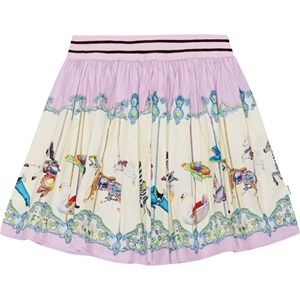 Lilla og råhvid, rundskåret nederdel i økologisk bomuld. Nederdelen er behagelig at have på og nem at komme i, med den elastiske stribet talje. Nederdelen har et print hele vejen rundt af en multifarvet karrusel.