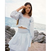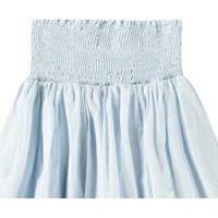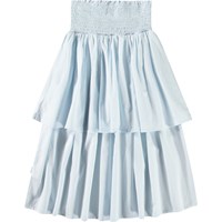 Lyseblå lang nederdel med et bredt bærestykke syet med smock, der gør den nem at komme i og behagelig at have på. Nederdelen har to skørter, der giver den volumen. Kombiner nederdelen med matchende top i samme farve og få et komplet sæt.