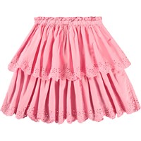 Pink nederdel i økologisk bomuld. Nederdelen har en fast talje med lynlås lukning, er rundskåret og rynker rundt i taljen. Nederdelen er mellemlang og har to skørter i forskellige længder med broderi anglaise langs kanten, Kombiner nederdelen med matchende top for et komplet sæt.