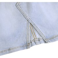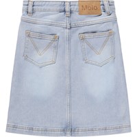 Lyseblå denimnederdel i økologisk bomuld med åben slids foran. Nederdelen har en klassisk A-facon, for- og baglommer samt trykknaplukning op til størrelse 140. I taljen er der en indvendig justerbar elastik, så pasformen nemt kan tilpasses.