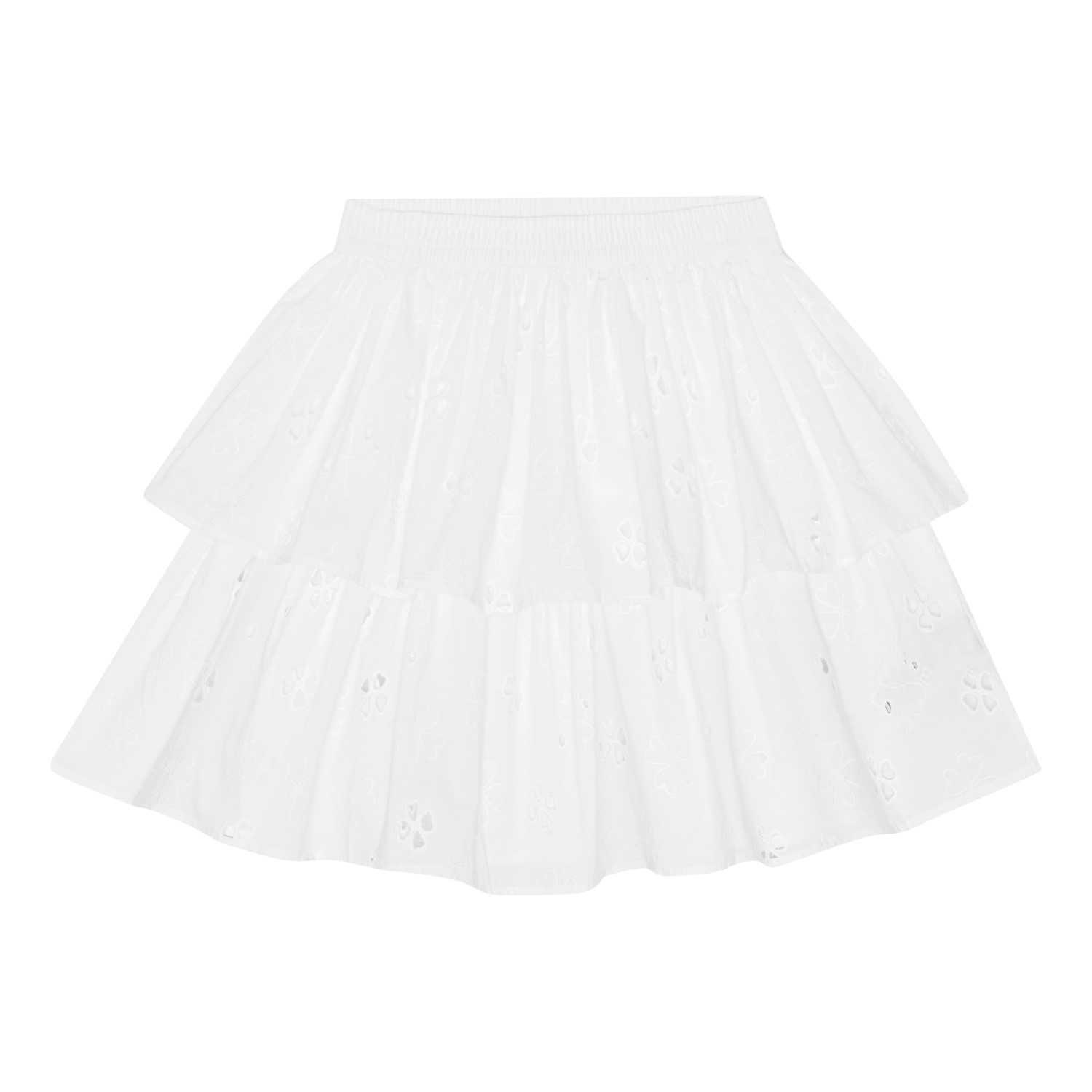 Hvid broderie anglaise nederdel i økologisk bomuld. Nederdelen er mellemlang og har to skørter i forskellige længder samt elastik i taljen, der gør den behagelig at have på.