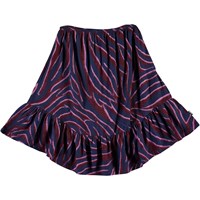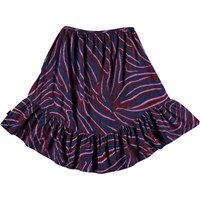 Brina er en blå nederdel med zebra striber i lilla og boardeuax toner. Nederdelen er kortere i siderne, hvilket giver, hvilket gør pasformen lidt mere levende. Nederdelen lukkes med lynlås.