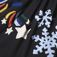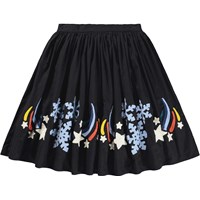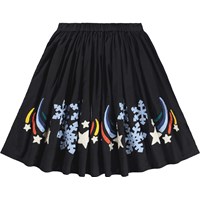 Sort knælang nederdel i økologisk bomuld, med farverigt broderi af stjerneskud og iskrystaller. Nederdelen har en fast talje foran, mens den bagpå er elastisk, så den er nem at komme i og behagelig at have på. Skørtet rynker rundt i taljen og giver nederdelen en flot volumen.