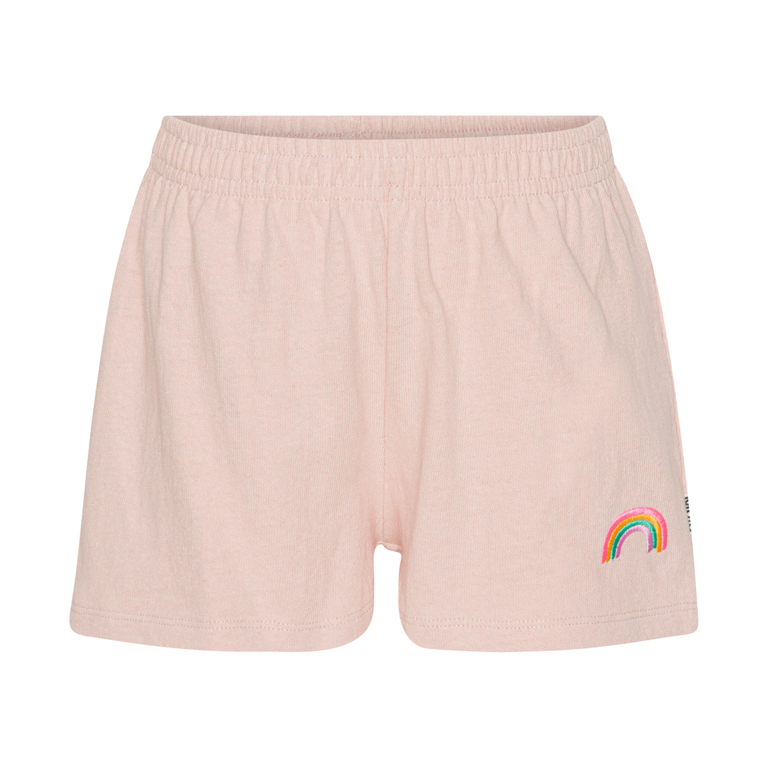 Akima er et par lyserøde shorts med elastik i 100% bomuld. Shortsene har elastisk talje og et regnbue broderi nederst på låret.