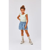 Alanis er et par lyseblå shorts med brede ben og allover printet, Love Peace Blue, med små lyse peace tegn, formet som hjerter. I taljen er der et bredt elastisk stykke, der giver shortsene en behagelig pasform.