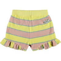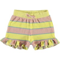 Ally er et par froté shorts med brede gule og rosa striber. Shortsene har flæsekant i bunden af benene og en elastisk talje med bindebånd.