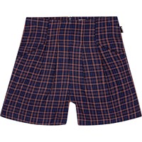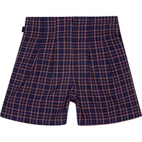 Højtaljede, brune og blå ternet shorts med lommer foran og fine læg både foran og bagpå. Nemme at tage på med en usynlig lynlås bagpå. Perfekt til at kombinere med en matchende blazer for et stilfuldt sæt.