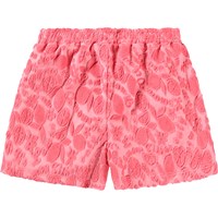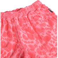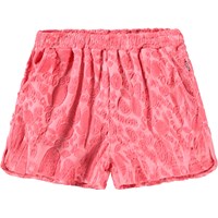 Lyserøde shorts med mønster af citrusfrugter i blød bomuldsfrotté. Shortsene går til midt på låret, har lommer, bindebånd i taljen og slidser i siden.