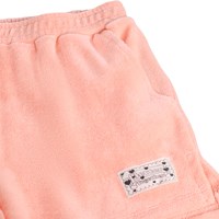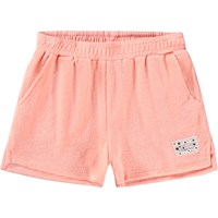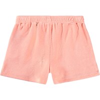 Koralfarvet shorts i blød, økologisk bomuldsfrotté. Modellen har elastisk talje, sidelommer og små slidser i siderne for ekstra bevægelsesfrihed. Den lette og afslappede pasform gør dem ideelle til sommerens aktive dage.