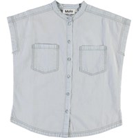 Rae er en oversized denimskjorte i lyseblå uden ærmer. Skjorten har frontlommer og knappelukning.