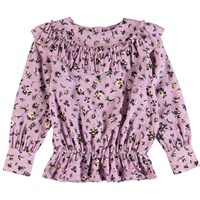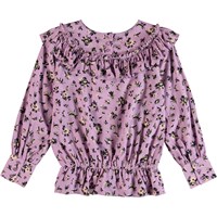 Raina er en lilla blomstret bluse med flæsekrave og elastik i taljen. Raina har lynlåslukning i nakken.
