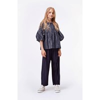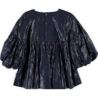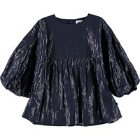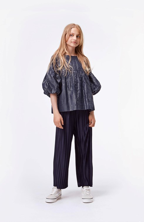 Raja er en flot bluse i mørkeblå med sølv striber og let puffede ærmer. Blusen har lynlåslukning i nakken.