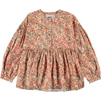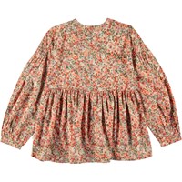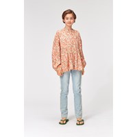 Raluca er en blomstret skjortebluse med volumiøse ærmer. Blusen har knappe lukning ved halsen.