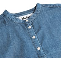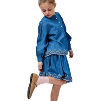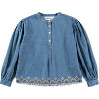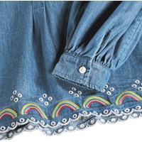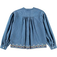 Blå denim skjorte i økologisk bomuld med puf ved skuldrene, smalle manchetter og halv knaplukning på fronten. Skjorten har en løs pasform og er pyntet med fine regnbuebroderier rundt i kanten.