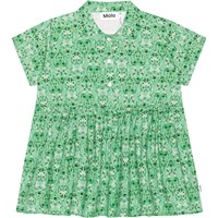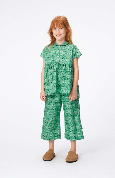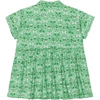 Grøn kortærmet skjortebluse i økologisk bomuld. Skjorten har en rund krave med tre knapper fortil. Skjorten har en skæring under brystet der er rynket, det giver den et elegant voluminøst udtryk. Printet er et multifarvet alloverprint af hjerter der er dannet af grønne og hvide blomster.