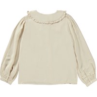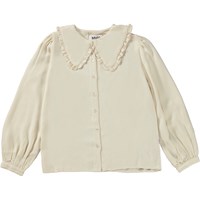 Råhvid skjorte i 100% viskose, der gør den blød og rar at have på. Skjorten har en Peter Pan krave med dekorative flæser, lange voluminøse ærmer med smalle manchetter, og knapåbning ned langs fronten med hvide knapper.