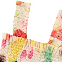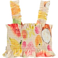 Råhvid croptop i økologisk bomuld med print af farverige, eksotiske frugter. Toppen har smock-effekt, flæsekant og brede stropper. Kombiner toppen med matchende bukser for et komplet sæt.