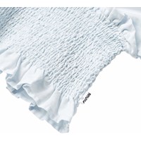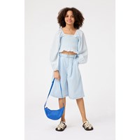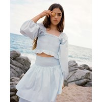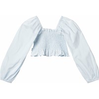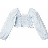 Lyseblå langærmet cropbluse i blødt bomuld. Blusen har posede ærmer med elastik ved skulder og håndled, samt smock-effekt, der gør den behagelig at have på og sidder til, hvor den skal.