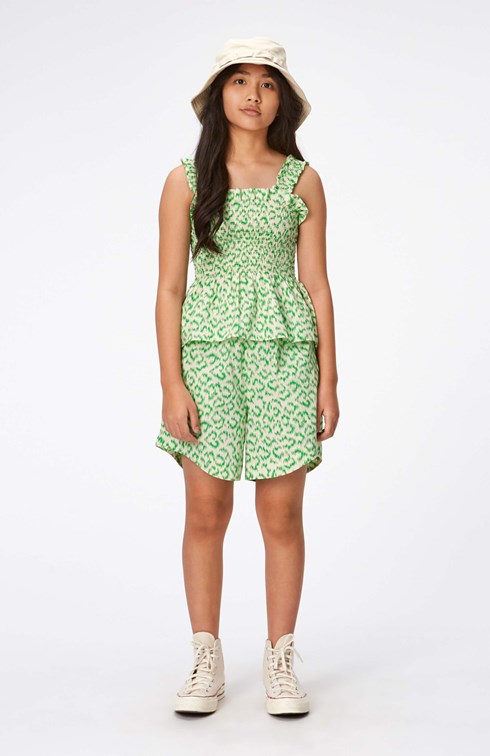 Ferskenfarvet off shoulder-top uden ærmer i blødt økologisk bomuld med stretch. Toppen har en bred flæsekant i poplin langs den elastiske halsudskæring, der gør, at kraven også kan bæres over skuldrene.