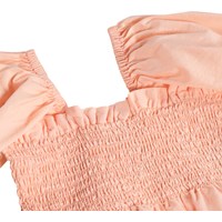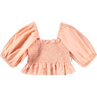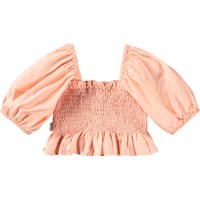 Blød, ferskenfarvet cropbluse med korte, posede ærmer og smock-detaljer, der giver en behagelig og fleksibel pasform. Ærmerne har elastik ved både skuldre og håndled, og blusen afsluttes med en fin, lille flæsekant i bunden.