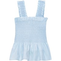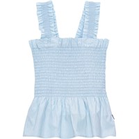 Pastel blå top i økologisk bomuld. Toppen har tætsiddende pasform, fine flæsestropper og smocken øverst er elastisk, hvilket skaber en voluminøs effekt i den nederste del.