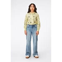 Støvet grøn skjorte i økologisk bomuld med broderie anglaise. Skjorten har lange ærmer med manchetlukning med to knapper, skjortekrave og knapåbning ned langs fronten. Skjorten er løstsiddende og flot at sammensætte med nederdel i samme materiale og farve.
