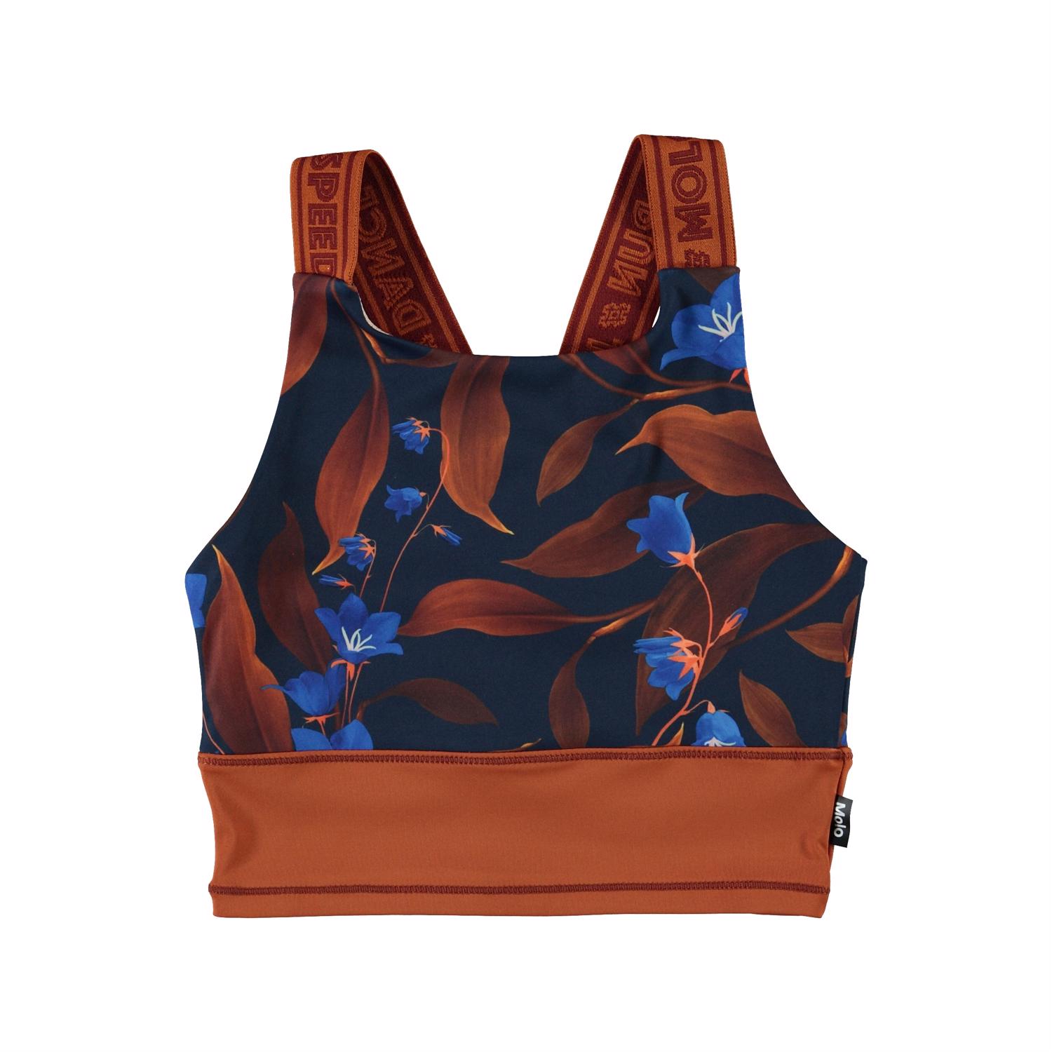 Oliva er en sportstop i blå med print af brune blade og blå blomster. Toppen har brede brune stropper med Molo tekst print, mens bunden af toppen er i samme brune farve. Toppen er perkekt under Molo's sportsjakker. Olivia er en del af Molo's sportskollektion, som er med til at binde mode og sport tættere sammen. Toppen er comfortabel og er lavet af tekniske materialer, der gør at den kan bruges både når intensiteten er høj eller når der bare skal slappes af. Molo’s sportskollektion er fremstillet med en unik high-performance teknologi kaldet HeiQ Smart Temp, der understøtter kroppens naturlige nedkøling. Kølefunktionen aktiveres, når du er varm og svedig. Kølefunktionen deaktiveres, når kroppen er nedkølet. HeiQ Smart Temp sikrer optimal komfort og ydeevne. Testet uafhængigt som sikkert for huden. .