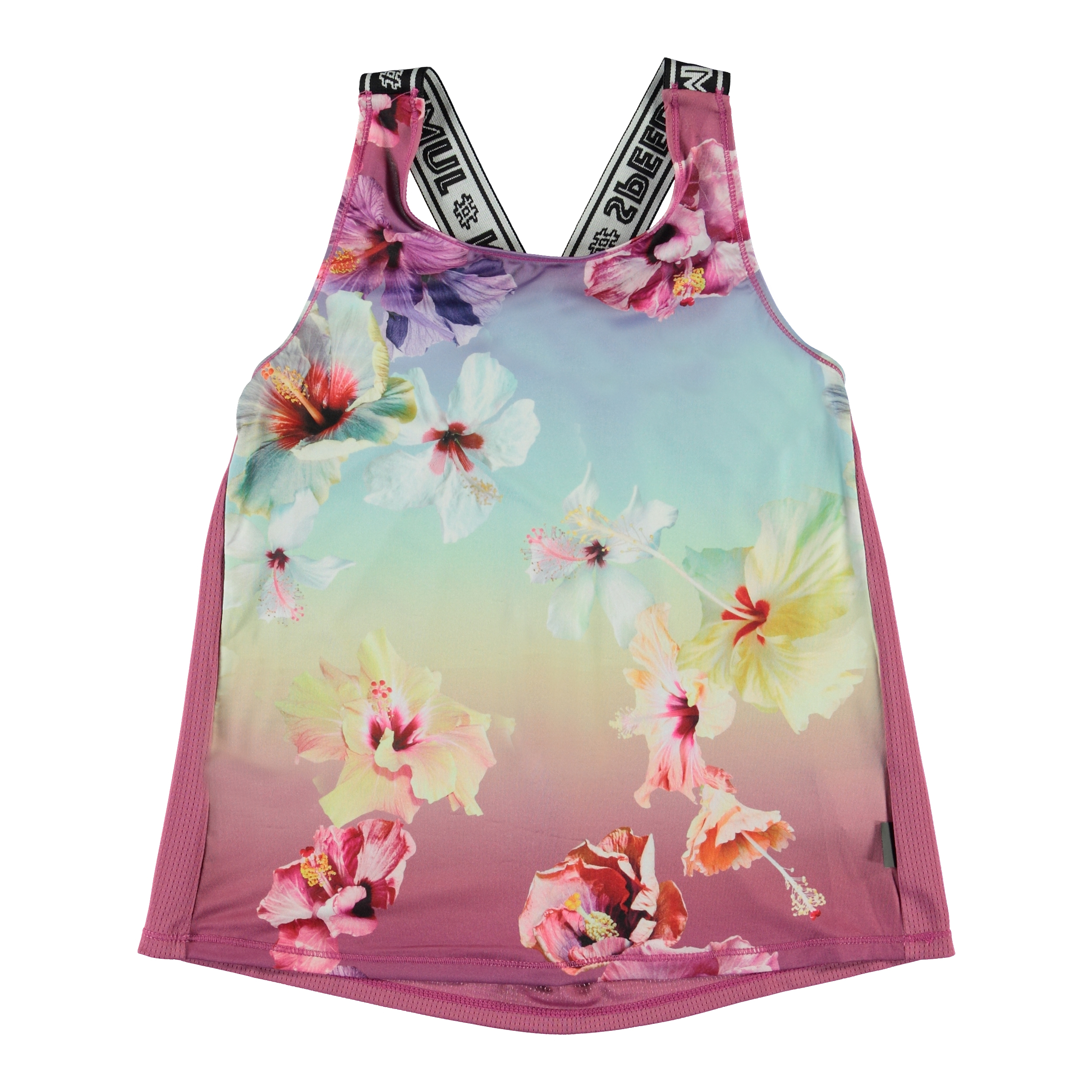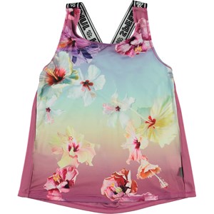 Oriana er en blomstret top med pink bagside og brede stropper hvorpå der er tekst. Toppen er en del af Molo's sportskollektion, som er med til at binde mode og sport tættere sammen. Toppen er comfortabel og er lavet af tekniske materialer, der gør at den kan bruges både når intensiteten er høj eller når der skal slappes af. Molo’s sportskollektion er fremstillet med en unik high-performance teknologi kaldet HeiQ Smart Temp, der understøtter kroppens naturlige nedkøling. Kølefunktionen aktiveres, når du er varm og svedig. Kølefunktionen deaktiveres, når kroppen er nedkølet. HeiQ Smart Temp sikrer optimal komfort og ydeevne. Testet uafhængigt som sikkert for huden. .